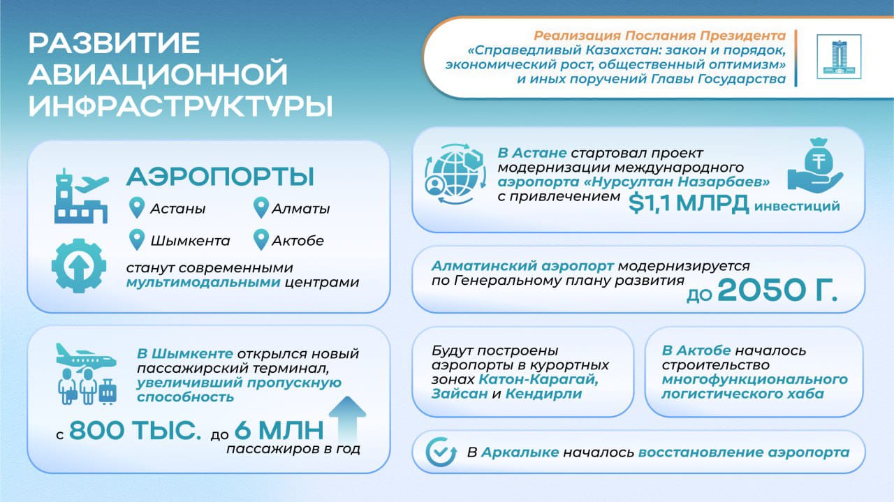 В рамках реализации Послания Президента Касым-Жомарта Токаева «Справедливый Казахстан: закон и порядок, экономический рост, общественный оптимизм» ведущие аэропорты страны – Астаны, Алматы, Шымкента и Актобе – развиваются как современные мультимодальные центры, предоставляющие полный спектр логистических услуг.