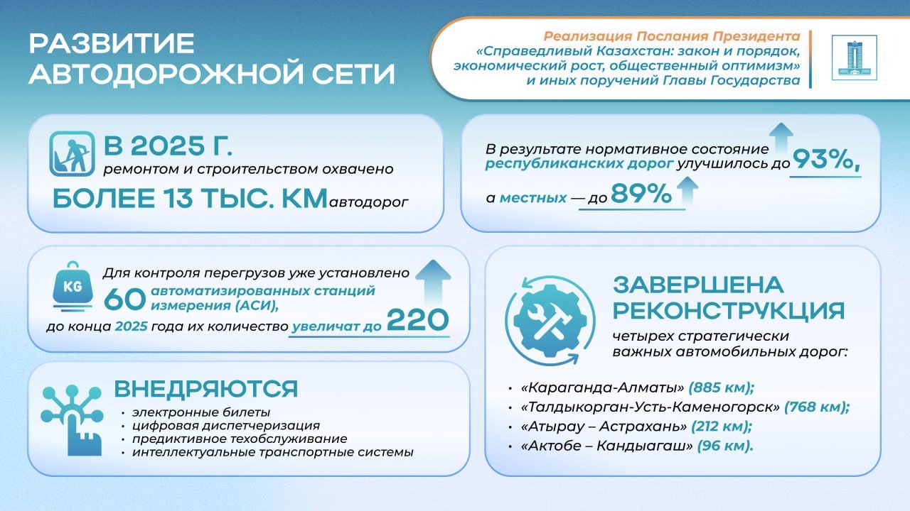 Реализация Послания Президента-2024: состояние республиканских дорог улучшилось до 93 %